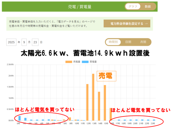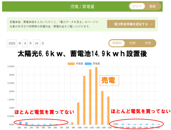 ほぼ0に近い買い電量で済んでいることがわかります。昼間は太陽光が「売電」もしております。